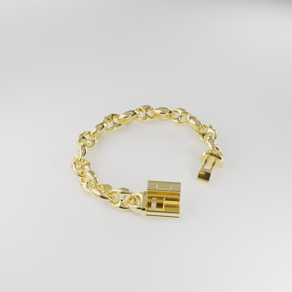 Bransoletka ta, inspirowana solidnymi łańcuchami używanymi na morzu, wyróżnia się unikalnym, geometrycznym wzorem. Owalne ogniwa, ozdobione poprzecznymi belkami, tworzą harmonijną i dynamiczną kompozycję, która zachwyca swoją prostotą i siłą. To biżuteria, która przyciąga uwagę i podkreśla charakter noszącej ją osoby.